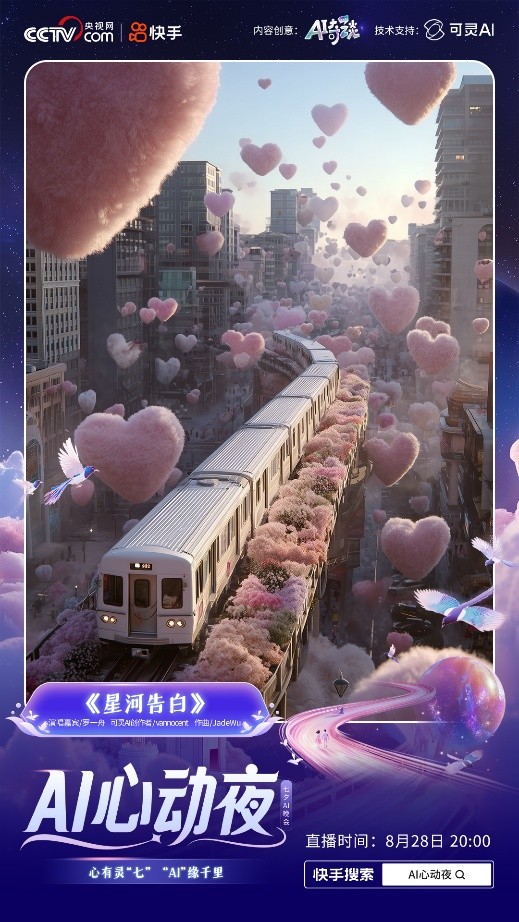8月28日晚8点,快手可灵AI与央视网共同打造的七夕晚会“AI心动夜”将正式开启。作为央视网首个以“AI视频叙事+传统文化”为核心的节日晚会,由可灵AI提供专业技术支持,将通过AI技术与文化传承、艺术创作、情感表达的深度融合,呈现一场跨越虚拟和现实、科技与文化交融的七夕盛典。晚会将在央视网多终端、快手等新媒体平台同步直播。